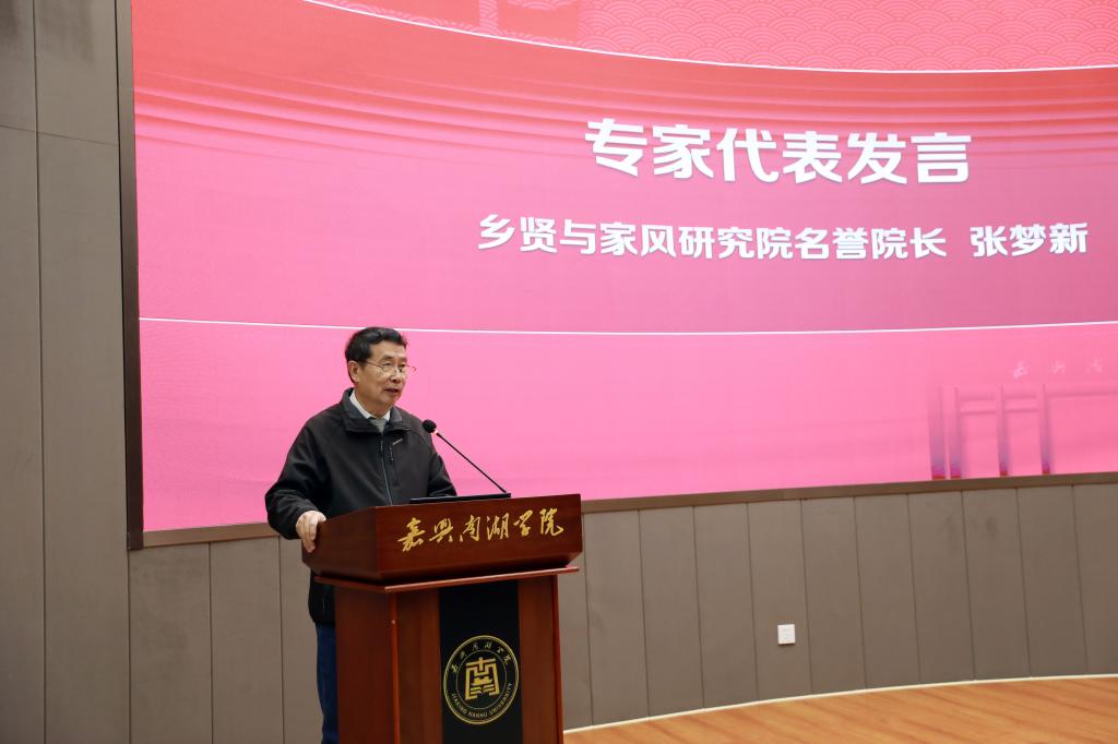 浙江大学传媒与国际文化学院教授、博导,乡贤与家风研究院名誉院长张梦新在发言中表示,嘉兴南湖学院成立“乡贤与家风研究院”,是响应习近平总书记在党的二十大报告中提出的“要弘扬中华传统美德,加强家庭家教家风建设”的具体行动,也是嘉兴南湖学院历史文化研究和进行思想品德教育的又一创新之举。他认为,研究院的成立,很有必要,也大有可为。一方面是因为嘉兴物华天宝、人杰地灵,文化名人辈出;另一方面“嘉兴南湖学院”的校名有着独特的红色资源和优势,所以更应深入研究并传承光大“红船精神”。
