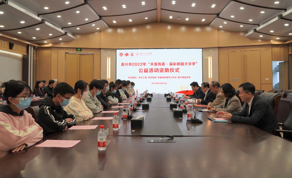 11月15日上午,由市关工委、市民政局、市福利彩票发行中心、嘉兴南湖学院共同主办的嘉兴市2022年“关爱有嘉·福彩助圆大学梦”公益活动资助仪式在嘉兴南湖学院第六会议室举行。嘉兴市政协副主席、校党委书记盛付祥,校党委副书记郭坚刚,市人大常委会原副主任、市关工委主任陈越强,市委老干部局副局长、市关工委副主任薛月芳,市民政局党委副书记、副局长沈伟强出席活动。