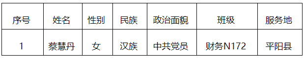 经全校招募,毕业生自愿报名,校团委层层筛选、资格审查,省项目办按学生填报志愿和岗位专业要求并结合体检结果完成2021年浙江省大学生志愿服务山区、海岛、边远地区计划录用工作。现将2021年我校“浙江省大学生志愿服务山区、海岛、边远地区计划”录取情况及服务岗位对接情况予以公示。公示时间从2021年9月4日至9月8日,如有疑问,请联系团委陈老师:0573-83646160。