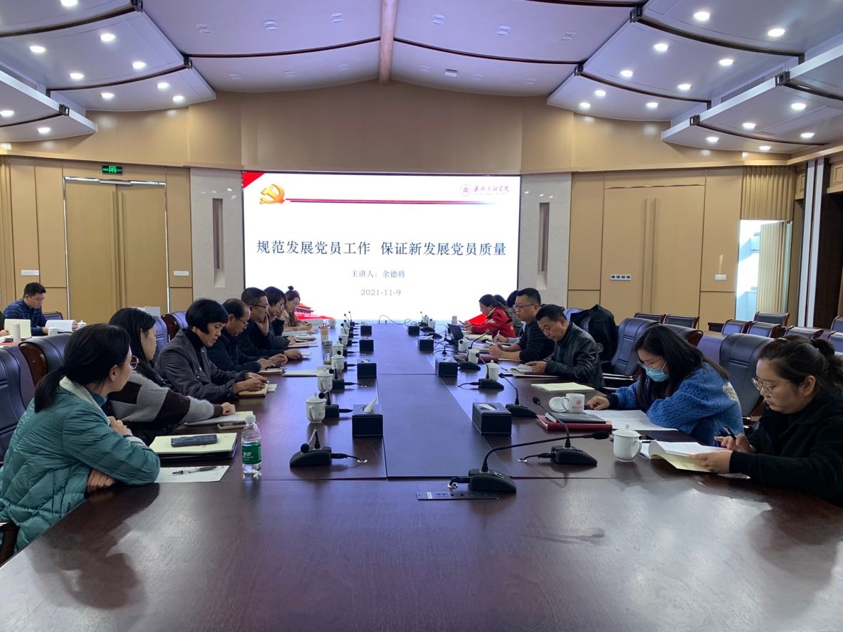 会上,余德将以“规范发展党员工作,保证新发展党员质量”为题,详细阐述了发展党员工作的重要意义、目前存在的问题、发展党员流程、落实发展党员工作要求等四个方面的内容。与会人员还就发展党员工作中遇到的一些具体问题进行了交流。