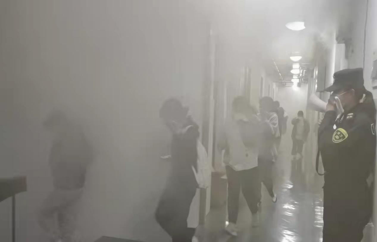 本次演练包括模拟火情、火警报警、消防救援三个环节。参演学生在相关人员的引导下有条不紊地用湿毛巾掩住口鼻迅速跑出宿舍。南湖消防救援大队相关人员在观摩后对本次演练暴露出的问题给予了指导。