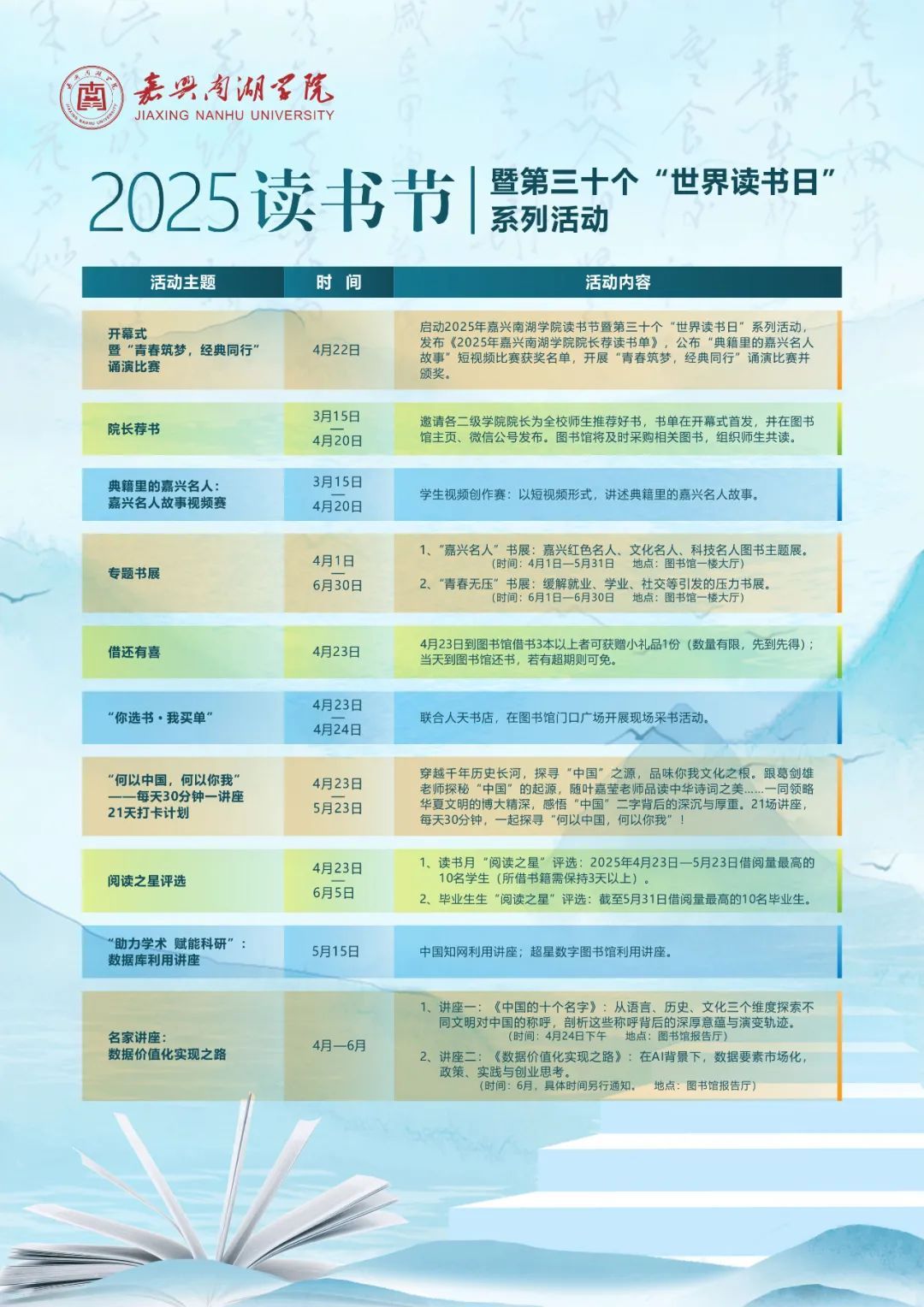 比赛中主办方还发布了为期两个月的嘉兴南湖学院2025年读书节暨第三十个“世界读书日”系列活动。